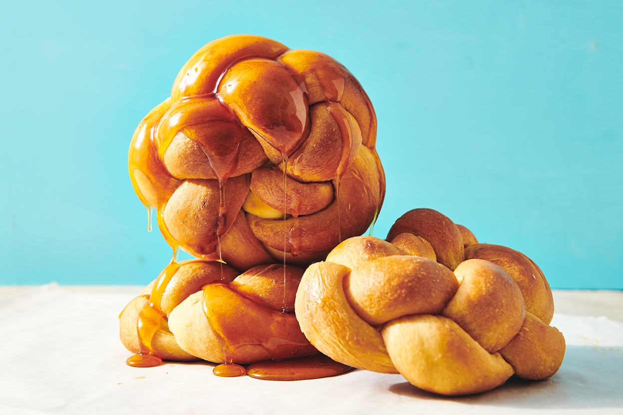 To shape the honey brioche: Divide the dough into six pieces. If making one large loaf, arrange them in a circle in a greased brioche mold, with the sixth one in the center. For individual breads, work with one piece at a time (keep the rest covered). Divide each into three strands, and braid them. Form the braid into a circle, then place into a greased 6" cake pans, or onto a parchment-lined baking sheet. Repeat with the remaining pieces of dough, and cover them all with greased plastic. Let the shaped bread(s) rise for 1 to 1 1/2 hours, until puffy-looking. After 45 minutes of rise time, preheat the oven to 375°F.