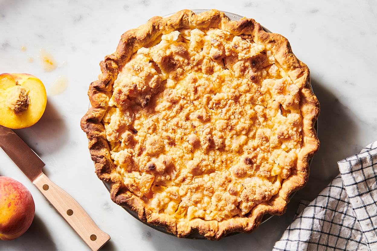 Bake for another 20 to 25 minutes, or until the pie has puffed, the streusel is very slightly browned at the edges, and/or a digital thermometer inserted into the center of the pie reads about 160°F.