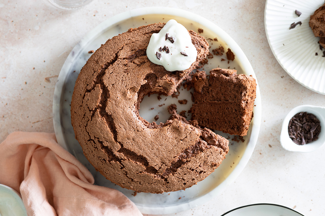 Remove the cake from the oven and invert the pan onto the neck of a heatproof bottle or funnel, to suspend the cake upside down as it sets and cools, about 2 hours.