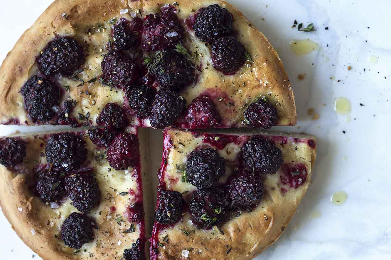 Fragrant with fresh thyme, this recipe, from Aran Goyoaga, gives a sweet twist to a traditionally savory focaccia. A sprinkling of flaky salt on top enhances the flavor of the fruit.