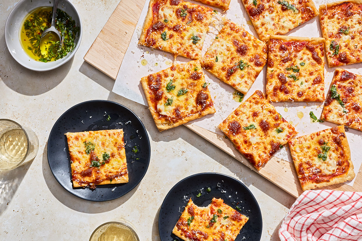 Remove the pizza from the oven. Using a bench knife, offset spatula, or Giant Spatula, slide the pizza out of the pan and transfer it to a wire rack or cutting board. Remove the parchment and slide the pizza back into the oven, directly on the center rack, for 4 to 6 minutes, until the sides and bottom are golden brown and crisp. Remove from the oven and transfer it to a wire rack.