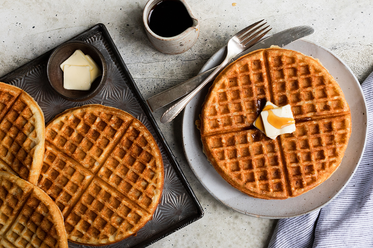 These light, crispy crusted waffles are so tasty your audience will never suspect they're gluten-free — and whole-grain to boot!