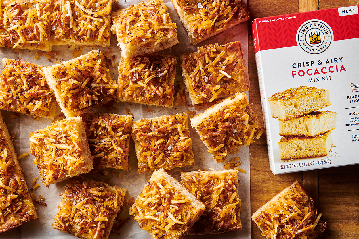 This potato focaccia is crispy and brown on the bottom and packed with shredded potatoes, almost like a giant hash brown. While this focaccia is not tall, the interior remains soft and tender and the shredded potato topping adds creamy richness. Because this recipe starts with our Crisp & Airy Focaccia Mix, it’s quick to put together. And there’s no prepping of potatoes, either: Starting with frozen shredded hash browns means all they need to do is defrost as the dough rises.