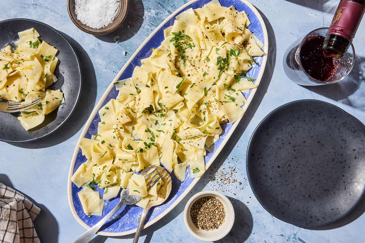 Adjust the pasta machine to the next increment and pass the dough through, flouring as necessary. Continue adjusting the setting and rolling the dough through the machine until you’ve reached the desired thickness (we prefer setting #8; use setting #7 for thicker noodles or #9 for thinner noodles). To roll by hand, gradually work the pasta from thick to thin with a rolling pin, incorporating letter folds regularly and pausing if the dough begins to snap back.
