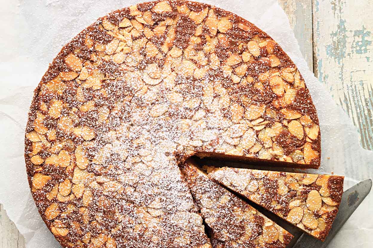 This cake is quick to put together, and would make a wonderful lunchbox snack cake or afternoon pick-me-up. The unmistakable flavor of honey gives this tender cake a lovely finish. The sliced almonds give their textural counterpoint to the soft grain of the cake. Dress it up for dessert with slices of fruit and a bit of ice cream.