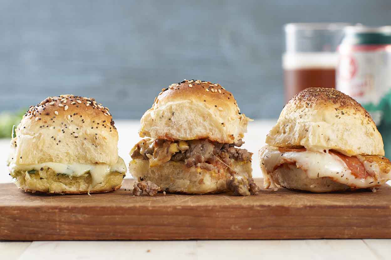 Expecting company? Bake off a batch of our Big Batch Quick Dinner Rolls. Working with one pan at a time, cut the whole slab of rolls in half without separating them, making tops and bottoms. Load the bottom half with your favorite sandwich fillings, add the top half, and warm the rolls through for easy, pull-apart, slider-sized sandwiches that are sure to please any crowd. We provide three of our favorite filling options below; each makes enough for a 9" round (or similar size) pan of rolls. But the possibilities are endless; use your imagination!
