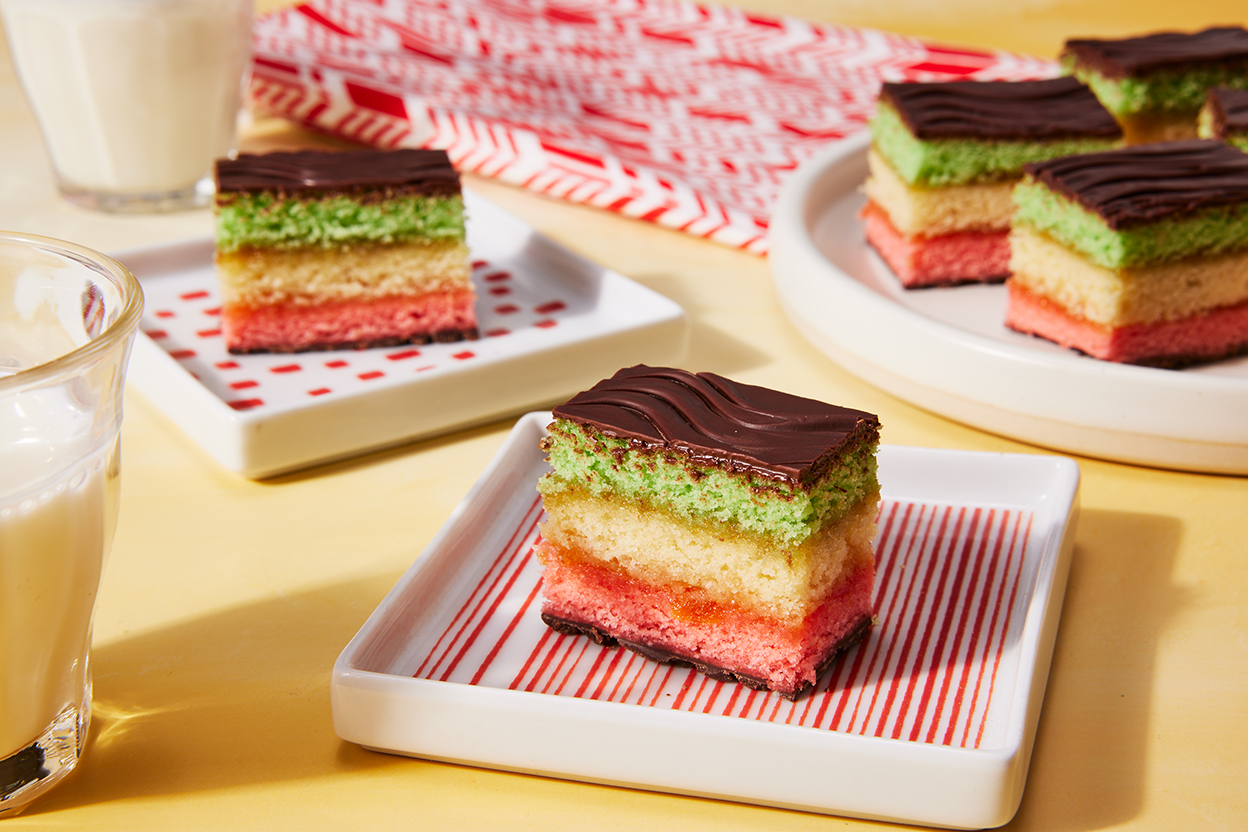Once fully set, use a warm chef’s knife to trim the sides of the square (baker’s snack!) for a neat presentation before cutting the remainder of the rainbow cookies into pieces. (We like using an 8 x 4 pattern to make slices about 1 3/4" x 1” in size.) Serve the rainbow cookies at room temperature.
