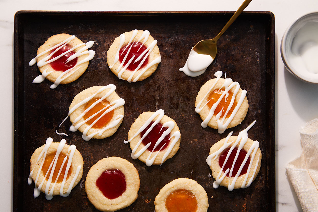 To finish: Fill the indentations in the warm cookies with 1 teaspoon of jam or preserves. Let cool on the pan for 10 minutes before transferring to a rack to finish cooling completely. Once cool, drizzle with the glaze.