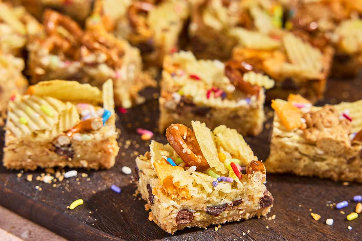 Just like the very best "kitchen sink" cookies, these bars live up to their name, packing in “everything but the kitchen sink” (plus, there’s no scooping or shaping required). Toss in the tail ends of a bag of chocolate chips, pretzels, crackers, or even cookie crumbs — the best version of these clean-out-the-pantry treats are salty, sweet, chewy, gooey, and crisp, all at once. They’ll satisfy your craving for something a little wild and wonderfully unexpected while embracing some no-waste creativity.
