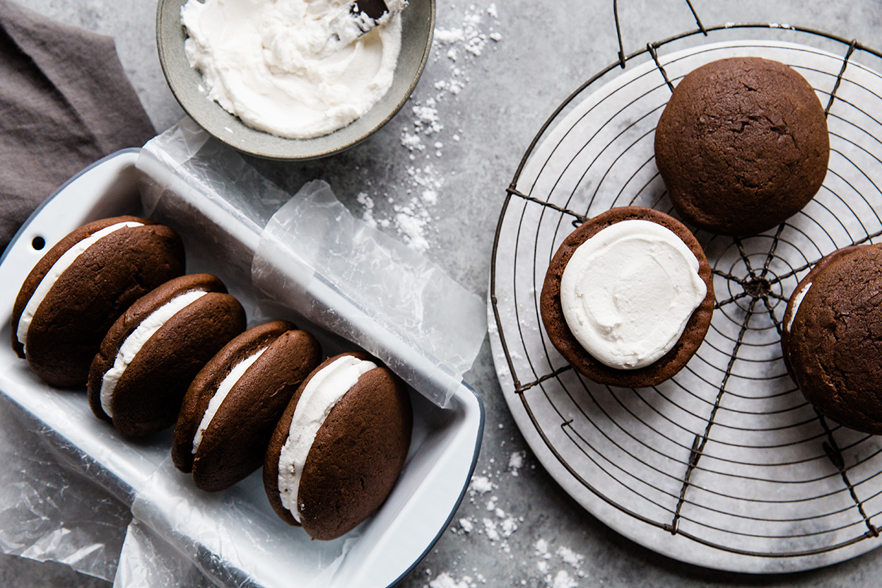 To assemble the whoopie pies: Turn the cakes over, so the flat side faces up. Spread the flat side of the cakes with the filling; top with the flat side of the remaining cakes.