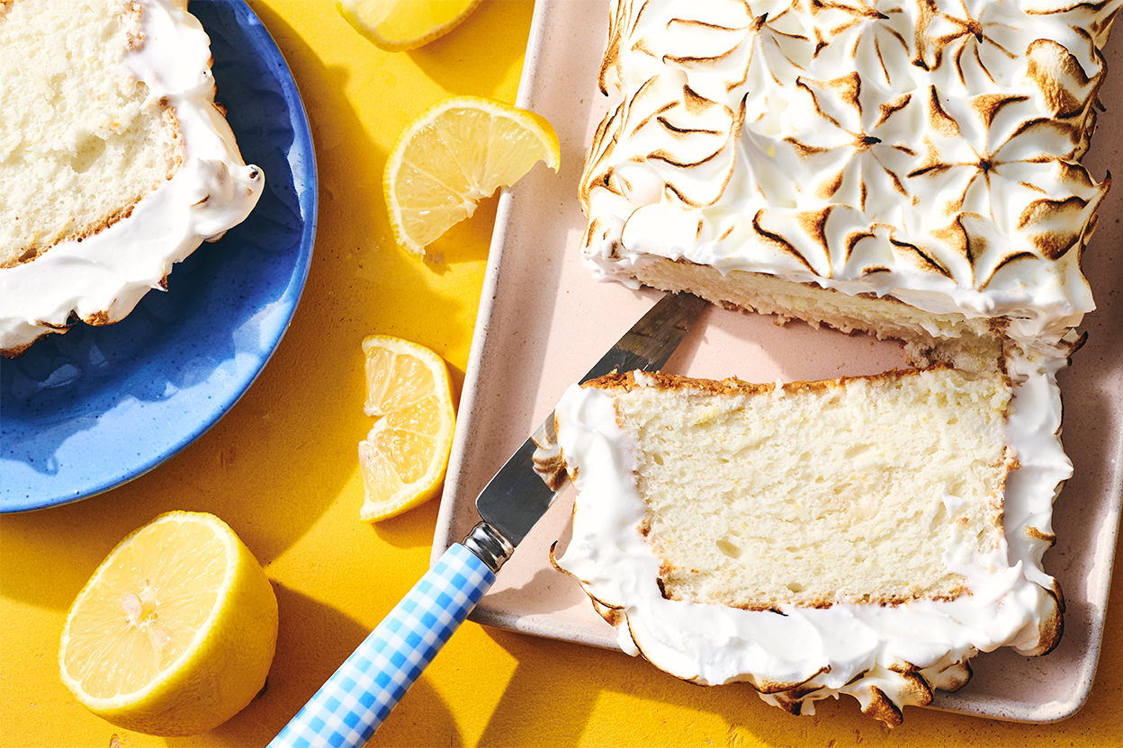 Fresh and light, this lemon angel food cake offers a bright, airy finish to any meal. Infused with fresh lemon juice and zest, it's baked in a simple loaf pan — no specialty equipment needed. Once cooled, the cloud-like cake is topped with a fluffy meringue. You can slather it on for a rustic look or pipe it for a more elegant finish. Then, torch or broil the meringue until it's golden brown and crisp on the outside, with a silky-soft interior.