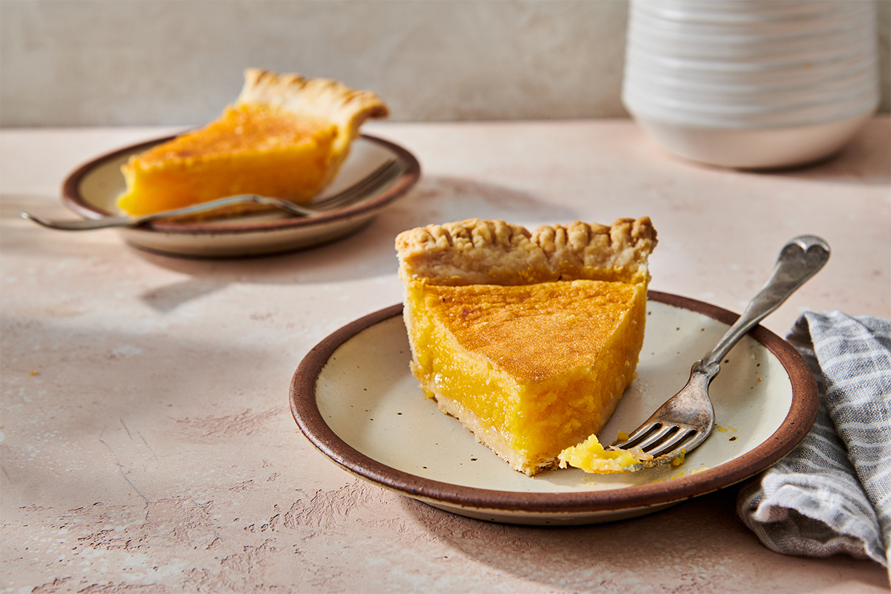 Chess pie? No one seems certain where the name for this type of pie comes from. A simple combination of eggs, sugar, and butter, with the tiniest bit of flour or cornmeal for thickening, chess pies appeared in print as early as the late 19th century. Whatever its provenance, this pie is perfect for those of you who love lemon, but don't like the somewhat "gluey" texture (or mile-high meringue) of a classic lemon meringue pie. This humble pie has no meringue to hide beneath; it's just lemon at its simple best.
