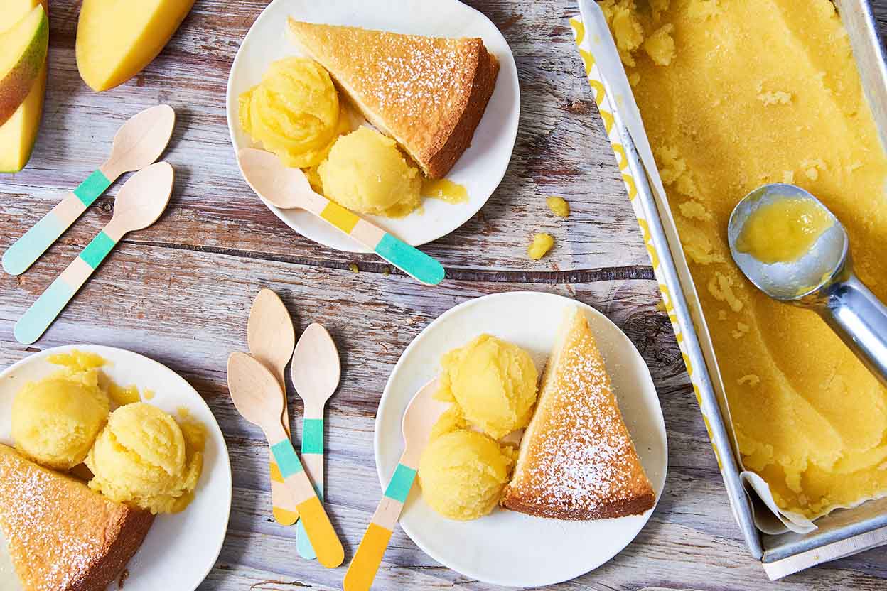 This bright-gold sorbet is packed with fresh, vibrant flavor. Enjoy it as is, or alongside a slice of cake — angel-food, pound cake, yellow cake, and hot milk cake (pictured with the sorbet) are all good choices.