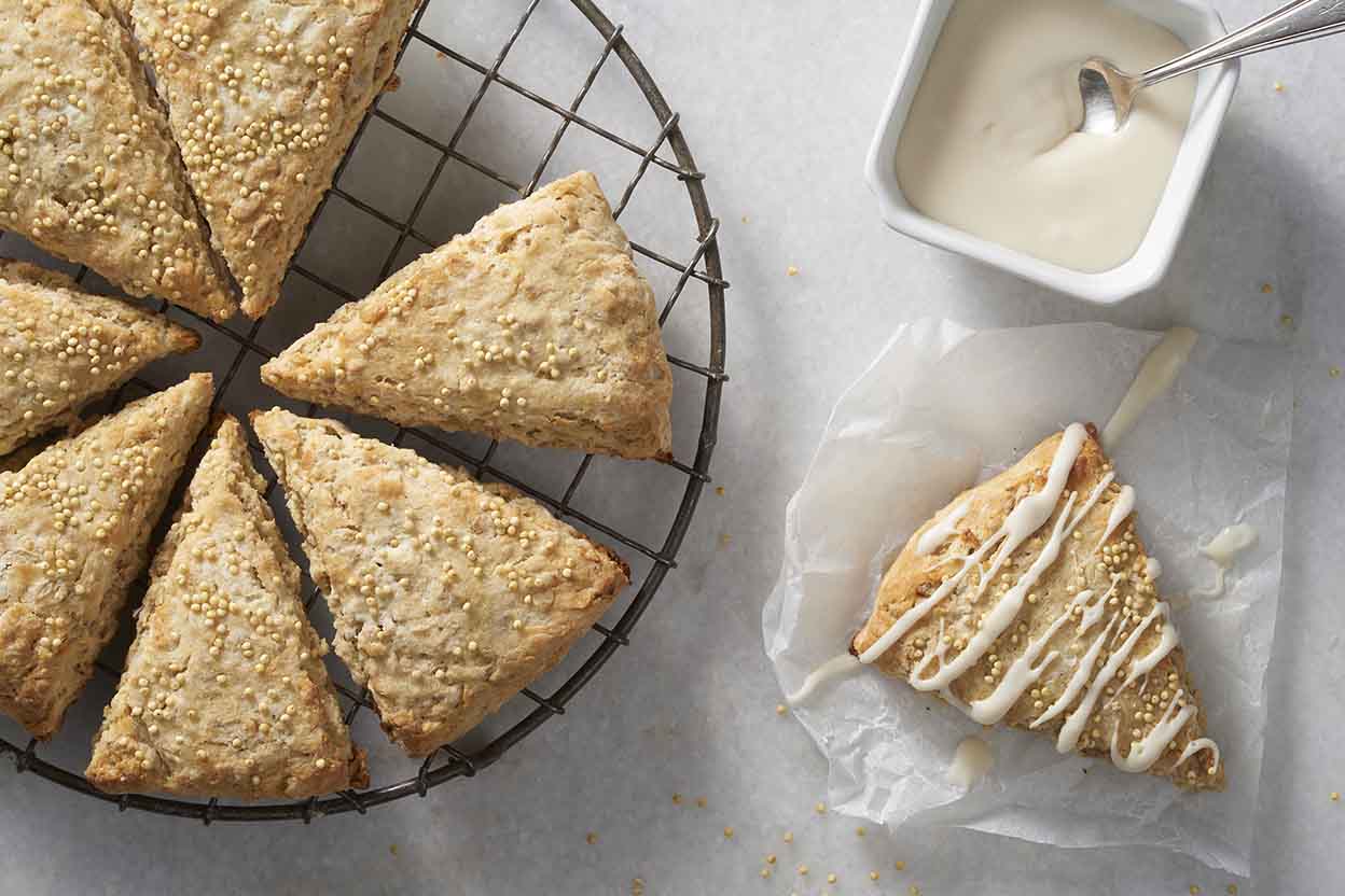 These tender scones have just the right amount of maple; it's their primary flavor, but not so pronounced that it over-takes the mild millet flavor, or that the scones end up cloyingly sweet. You can choose to skip the glaze, if you're a scone purist, but we particularly love the contrast between sweet, maple-y glaze and delicate, crunchy, whole grain scones.