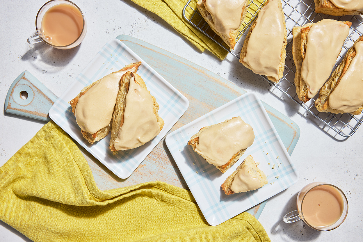 While the scones are still slightly warm, spread about 2 teaspoons of glaze on top of each. Set aside briefly for glaze to set.