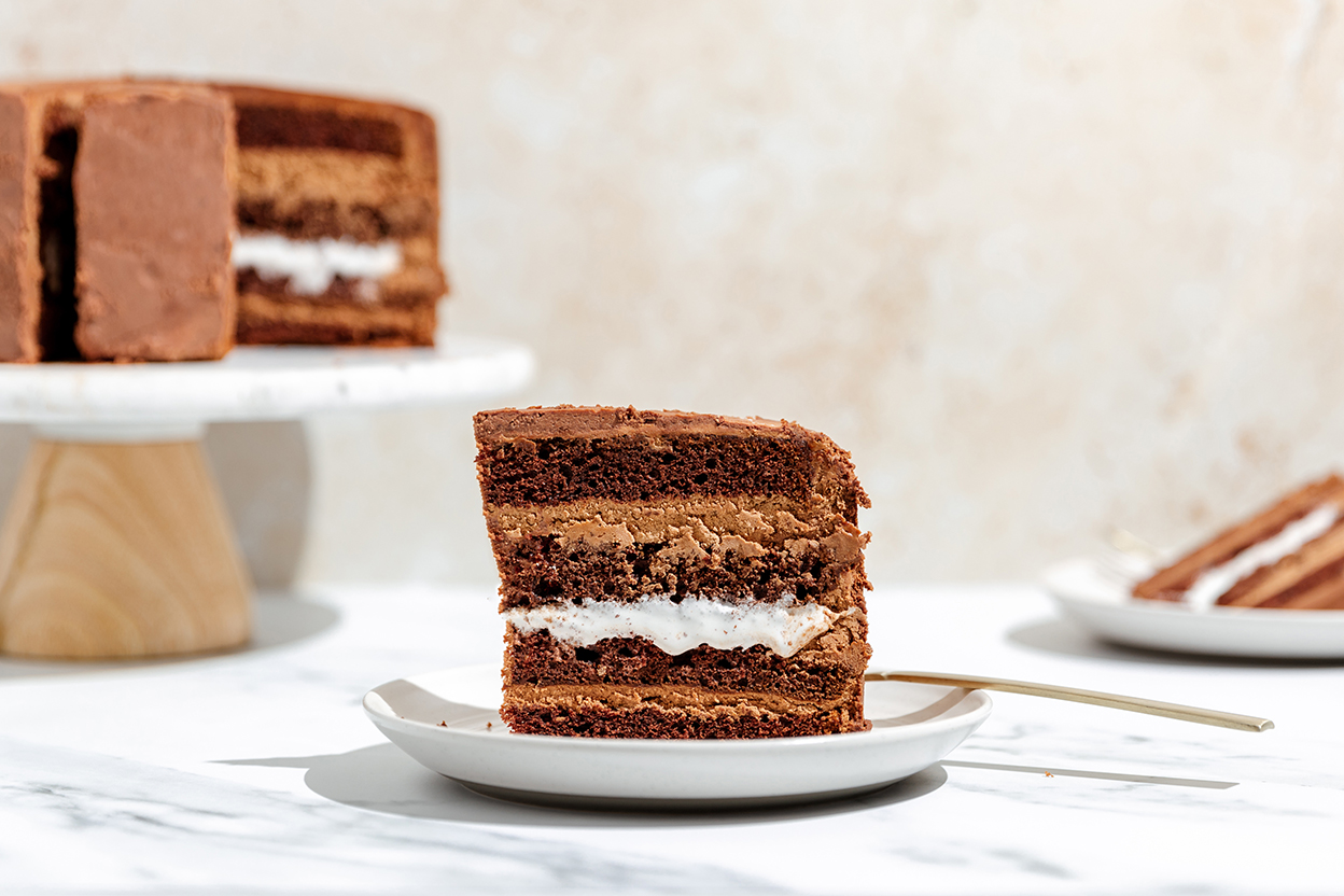 To assemble the cake: Using a long serrated knife, divide each cake round into two layers. Place one layer on your serving plate and spread with a 1/2"-thick layer of the whipped ganache. Add another layer of cake.