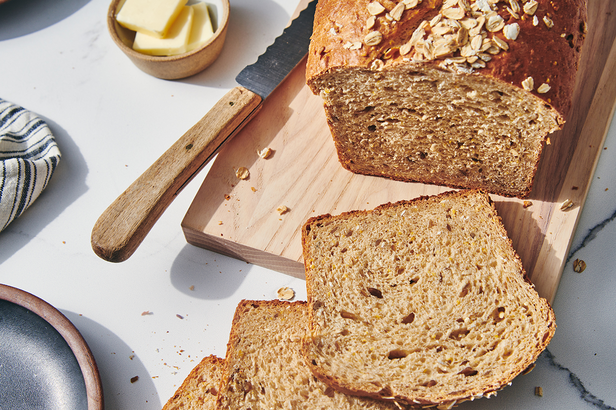 This beautifully risen loaf is packed with whole grains, including whole rye, wheat, and oats. Sunflower seeds and cornmeal add subtle crunch, while butter and brown sugar add a touch of tenderness and sweetness. This multigrain bread is ideal for any kind of sandwich and makes perfect toast, especially when slathered with butter and jam.