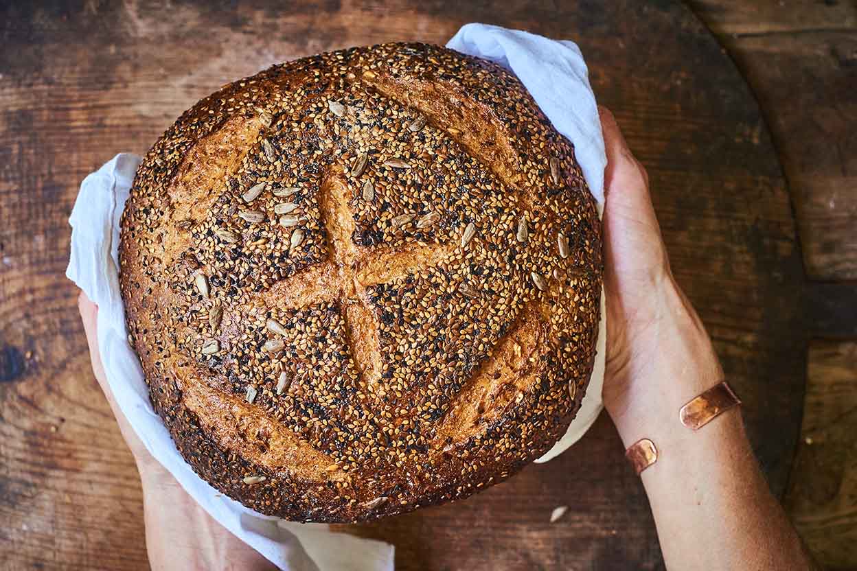 This versatile sourdough loaf can be made with your choice of whole grains or grain blends. A generous topping of seeds adds crunch and flavor. See "tips," below, for a six-grain honey version of this loaf.