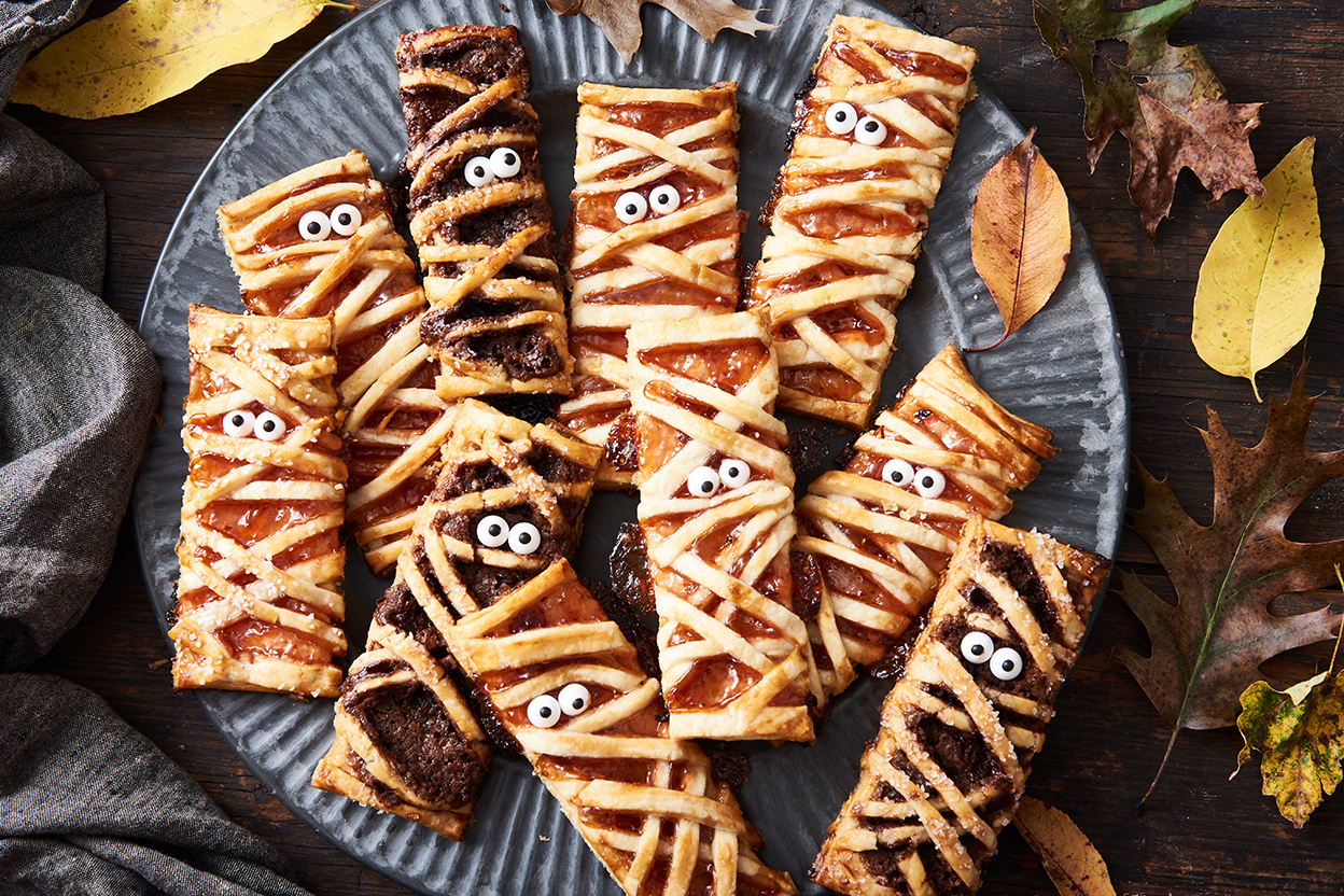 No tricks, just treats! Mummify your favorite pie dough and get in the Halloween spirit with these mummy hand pies. Fill half with jam or pie filling (blood-red cherry pie filling lends an especially spooky appearance!) and the other half with cinnamon sugar. The result is handheld desserts that are better than anything you'd find in a candy basket.