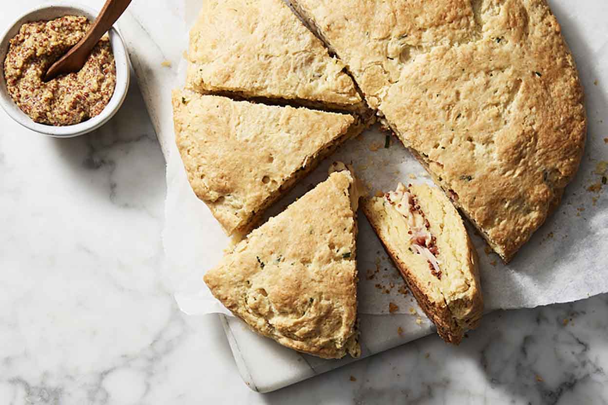 Mustard gives herb-laced, buttery dough a piquant flavor in these savory biscuits filled with ham and cheese. Baked together then sliced in wedges, they're like the best marriage of a biscuit and a grilled cheese sandwich.