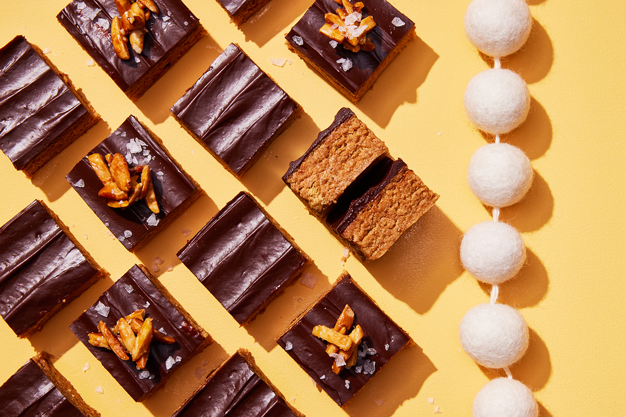 12. Once the chocolate has set, remove the bars from the pan. Cut the almond butter bars into 36 squares; a table knife (butter knife) or bench knife works well here (a hot knife will keep things very clean). Gently press some candied almonds onto the top of each piece, then let the bars rest, uncovered, for several hours (overnight is best), until the chocolate is firm. Serve at room temperature.