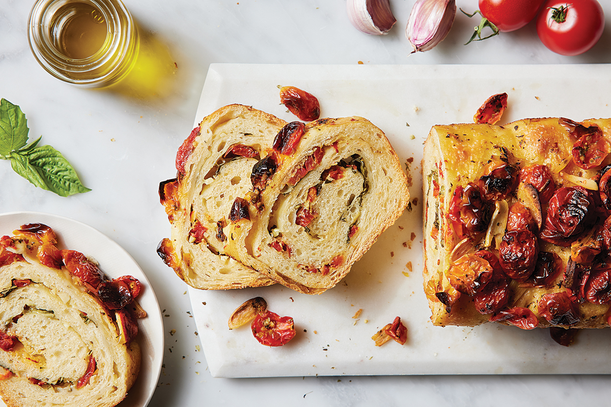 Line the tomato slices or scatter the cherry tomatoes down the loaf, and use the garlic cloves (whole or sliced) to fill any empty spaces.