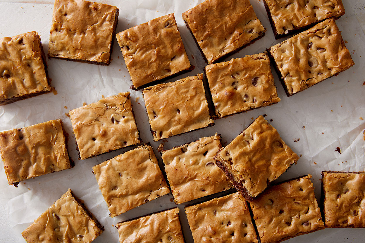These chewy, dense, moist bars, made with organic flour, are suffused with brown sugar and packed with chocolate chips.