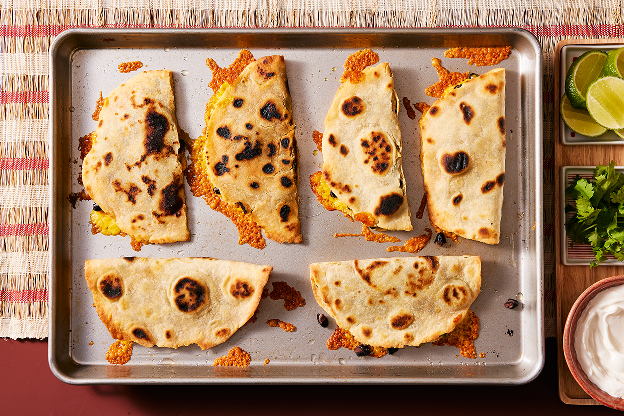 If you’re in the business of making a lot of quesadillas (hello, toddler parents), this just might be the fastest, easiest method to make quesadillas for a crowd. Instead of standing over the stove, you can make six quesadillas at once in the oven. While you can use storebought tortillas, we highly recommend using our 50/50 Corn and Flour Tortillas: The tortillas become super crisp in the oven while keeping their tender chew. The filling for these oven quesadillas is the classic, irresistible combination of beans and cheese, but you can go simpler or more elaborate to accommodate your eaters.