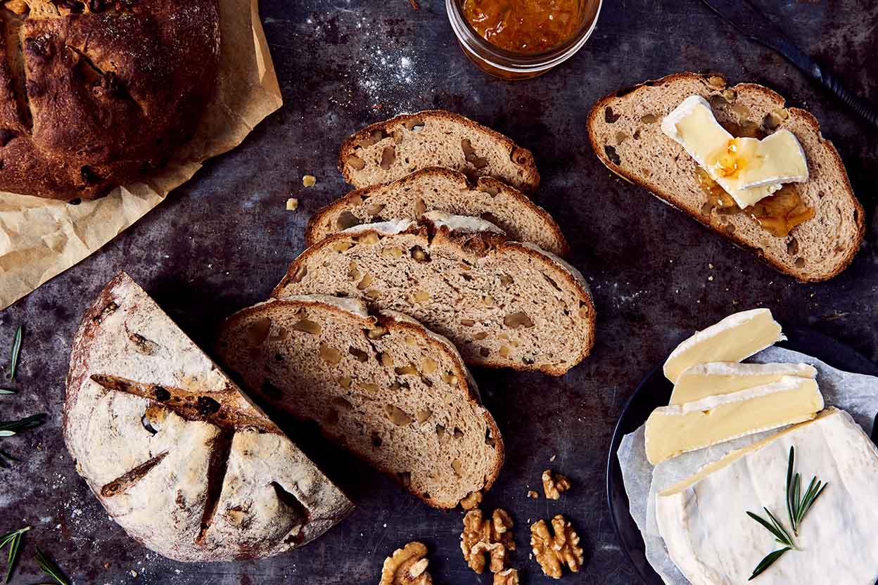 Weigh your flour; or measure it by gently spooning it into a cup, then sweeping off any excess. Combine all of the ingredients except the nuts, and knead — by hand, mixer, food processor or bread machine — until smooth.