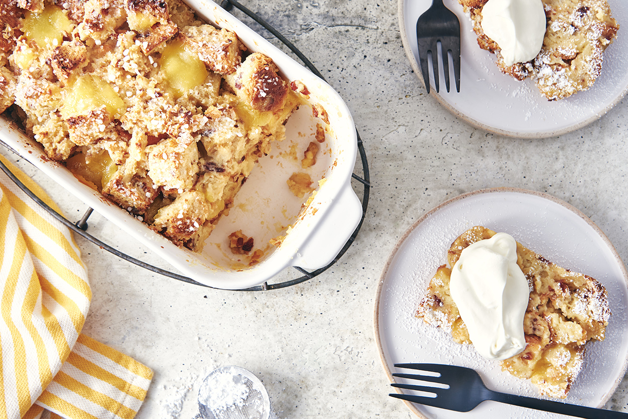 Wondering what to do with the leftover Christmas panettone (or for that matter, the Easter dove bread, or any other sweet/holiday bread you're trying to finish up)? This simple bread pudding, made in a loaf pan and served in slices, is an engaging combination of sweet/tart flavors, and smooth interior with a crunchy sugar topping. Baked-in lemon curd filling takes it over the top. By the way, you don't HAVE to use a holiday sweet bread in this pudding. Though often those breads offer the bonus of bits of dried fruit and citrus-vanilla flavor, any slightly stale bread is fine.