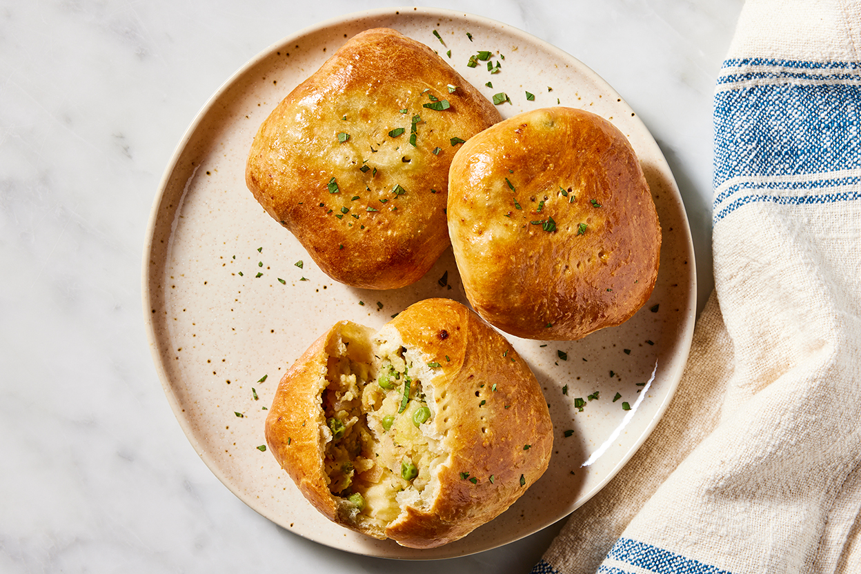 Once the potatoes have cooled slightly (they should still be warm but not hot), use your fingers to crumble the potatoes into a large mixing bowl. They'll look like coarse, fresh breadcrumbs. Add the sautéed onions, along with the peas, salt, za'atar packet, and red pepper flakes; stir together. Add the egg, feta, and mint; stir to combine all the filling ingredients. Season with salt to taste.