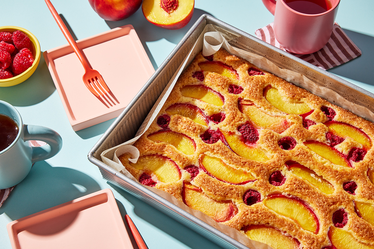 Peach Melba, a 19th century dessert composed of poached peaches, raspberry sauce, and vanilla ice cream, gets a modern-day spin in this fast and easy snacking cake. The cake comes together in under an hour, with no mixer required. And while this recipe is an homage to the original, one element is nonnegotiable: the ice cream or whipped cream that’s served alongside.
