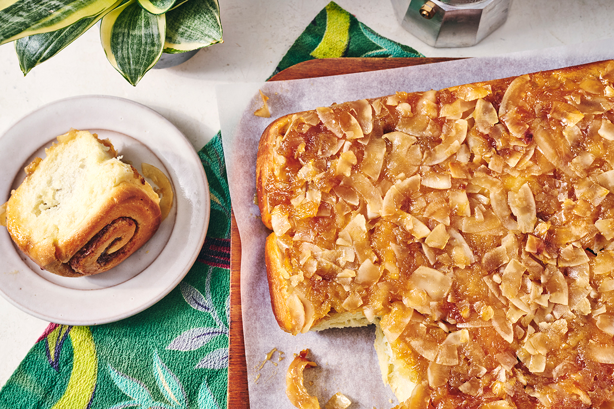 A creative invention from the Iowa State Fair by Lana Ross of Indianola: tender, cinnamon-filled dough is baked atop sweet, coconut-laced pineapple, then flipped upside down for a show-stopping result.