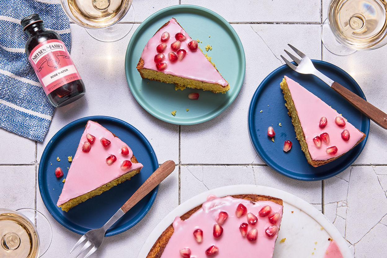 This pistachio cake calls on iconic Persian ingredients — pistachio, rose, and pomegranate — to create a beautiful green-hued cake that is tender, moist, and bursting with vibrant flavors. The batter is made entirely in a food processor and comes together in about 10 minutes, and the glaze showcases pomegranate, part of the Persian Jewish Rosh Hashanah seder. It’s the perfect addition to a Rosh Hashanah table.