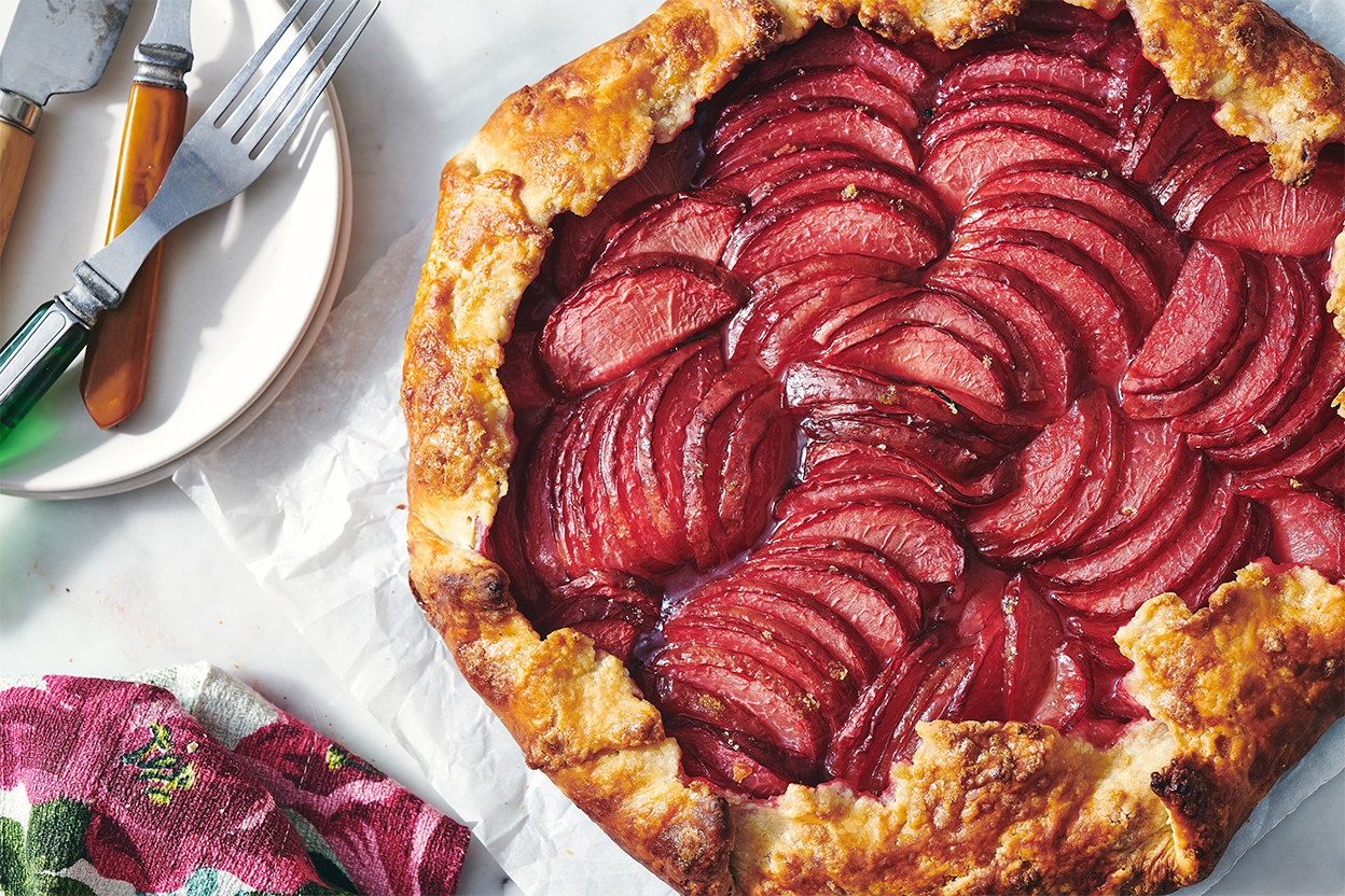 The beautifully rich color and flavor of baked plums make them a natural partner for coconut or date sugar in this lightly sweet galette. Featured spices? A hint of ginger and a touch of allspice.