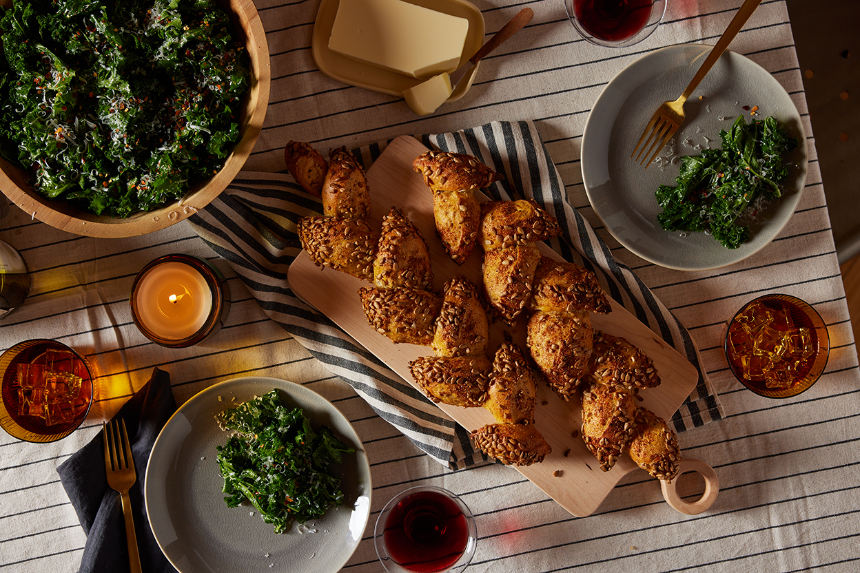 Clear the baking sheet, reserving the used seed mixture in a separate bowl, then distribute the remaining sunflower seeds on the baking sheet, sprinkle the remaining spice mixture over top, and shape and seed-crust the second piece of dough. (This two-step process ensures that both loaves get even seeds and spice; otherwise, the first loaf will pick up all the spice.)