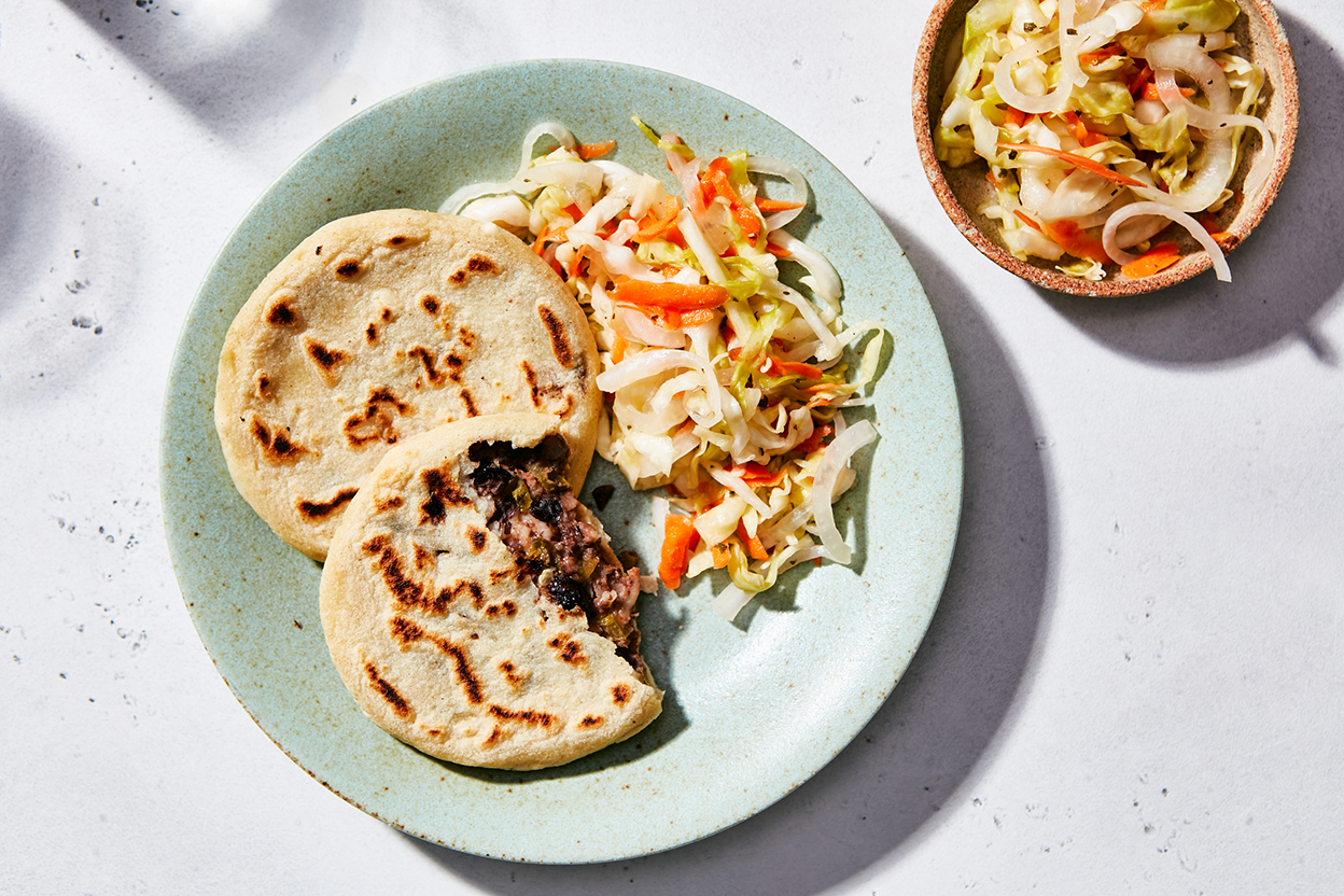 Briefly blend the bean mixture (using a blender, food processor, or hand blender); you should have a somewhat lumpy paste, soft but still able to hold its shape; think canned refried beans. If the beans are too thin, return the mixture to the pot to cook longer; if too thick or dry, add more water. Adjust seasonings to taste, then set the beans aside until you’re ready to assemble the pupusas.