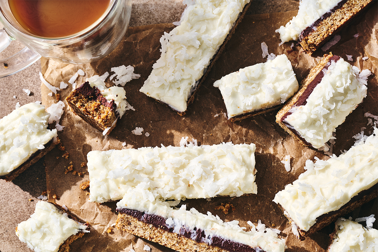 These coconut bars use four different kinds of coconut to ensure you get quadruple the coconut flavor in every bite. Coconut oil, sugar, and extract come together in the cookie-like base, then a layer of bittersweet chocolate filling is spread on top, then a coconut frosting featuring both coconut milk powder and shredded coconut is the final touch. Make these layered coconut bars the next time you're seeking the floral, tropical taste of coconut at its best.