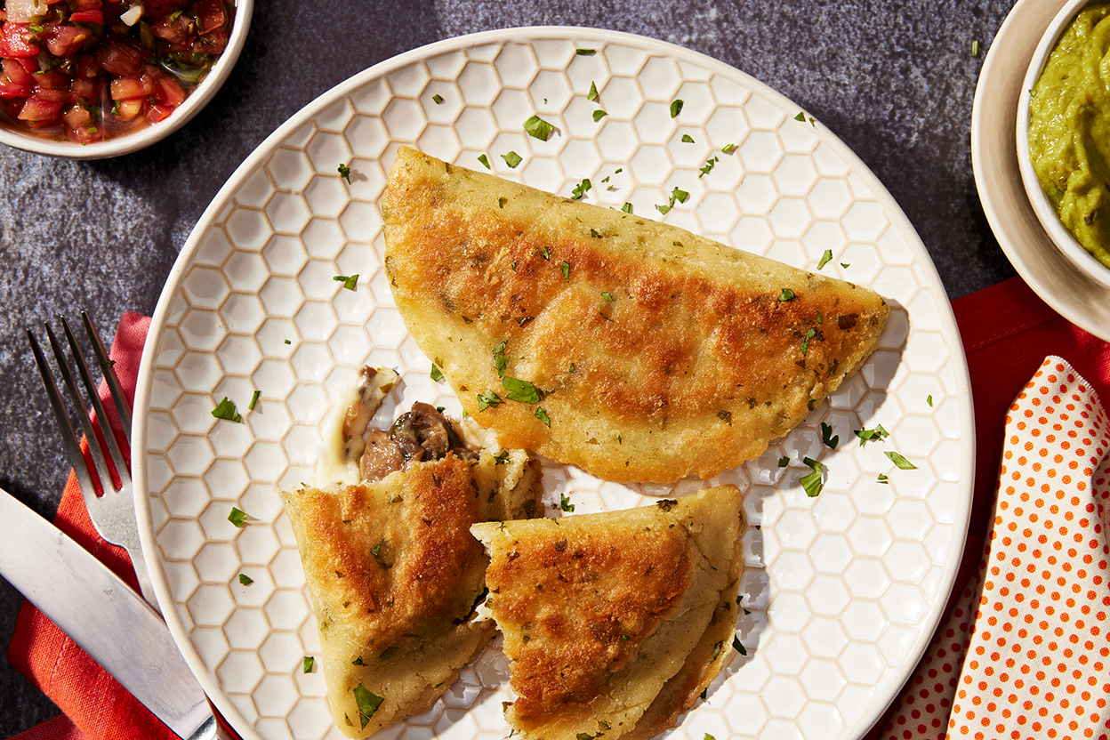 In this traditional Mexican cheese quesadilla recipe (also called quesadillas fritas), masa is stuffed with garlicky sautéed mushrooms and cheese, then cooked — deep-fried or seared — until the dough is golden-brown and the cheese is melted. Yes, these quesadillas take longer than what you’d make with packaged tortillas from the grocery store, but the corn flavor and the melty, crisp-yet-soft texture is unparalleled. Serve with salsa and guacamole for a delicious vegetarian snack, appetizer, or side dish.