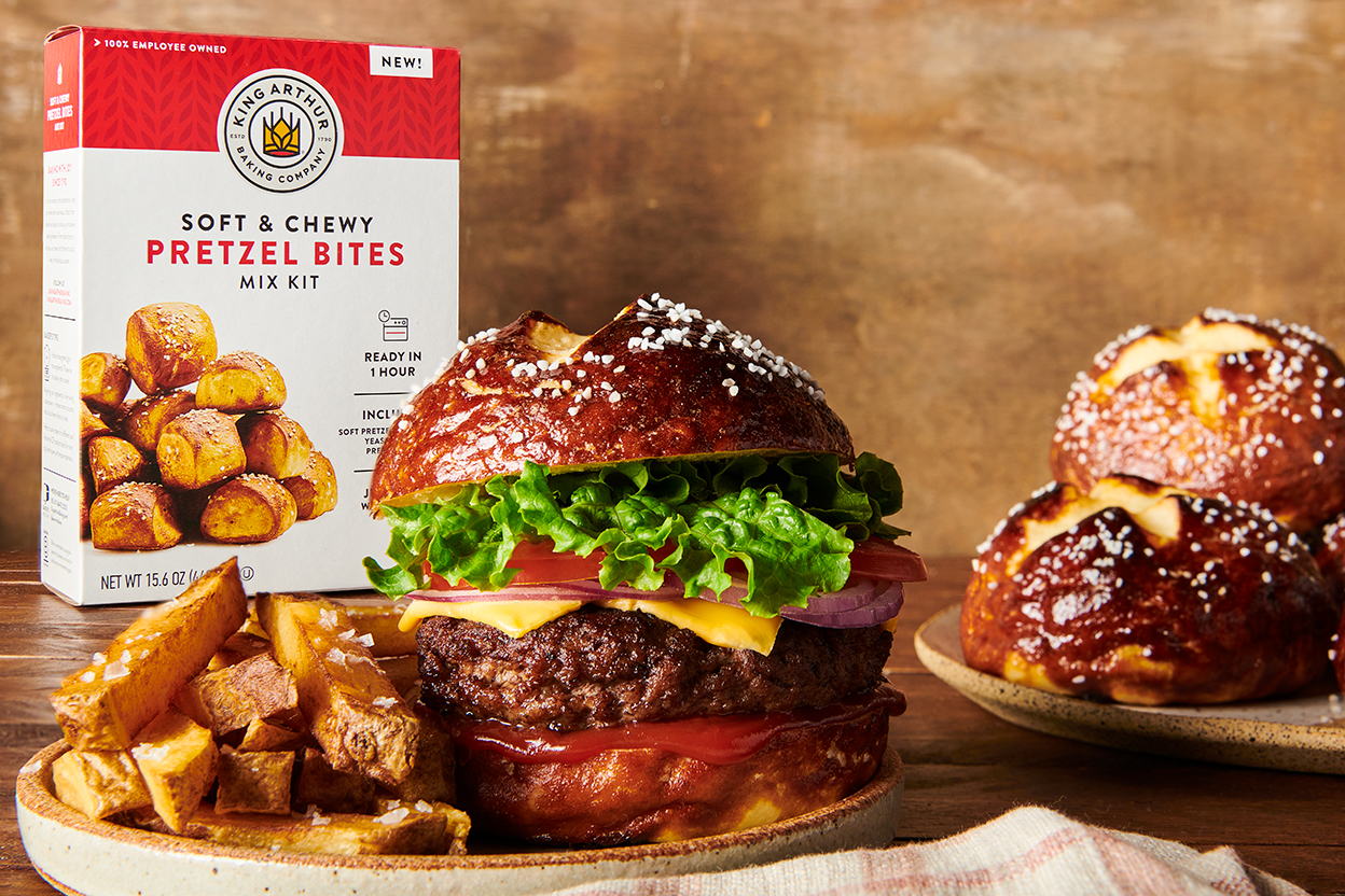 These easy pretzel buns are the ideal combination of soft and chewy while also being sturdy enough to withstand any fixings you can dream up: sausage, peppers, and mustard; pulled pork; arugula, cheese, and prosciutto. With a box of our Soft & Chewy Pretzel Bites Mix, you’ll only need water and a touch of vegetable oil to mix up the dough. And because the distinct pretzel color and flavor comes from a glaze packet, there’s no lye (or even baking soda) necessary.