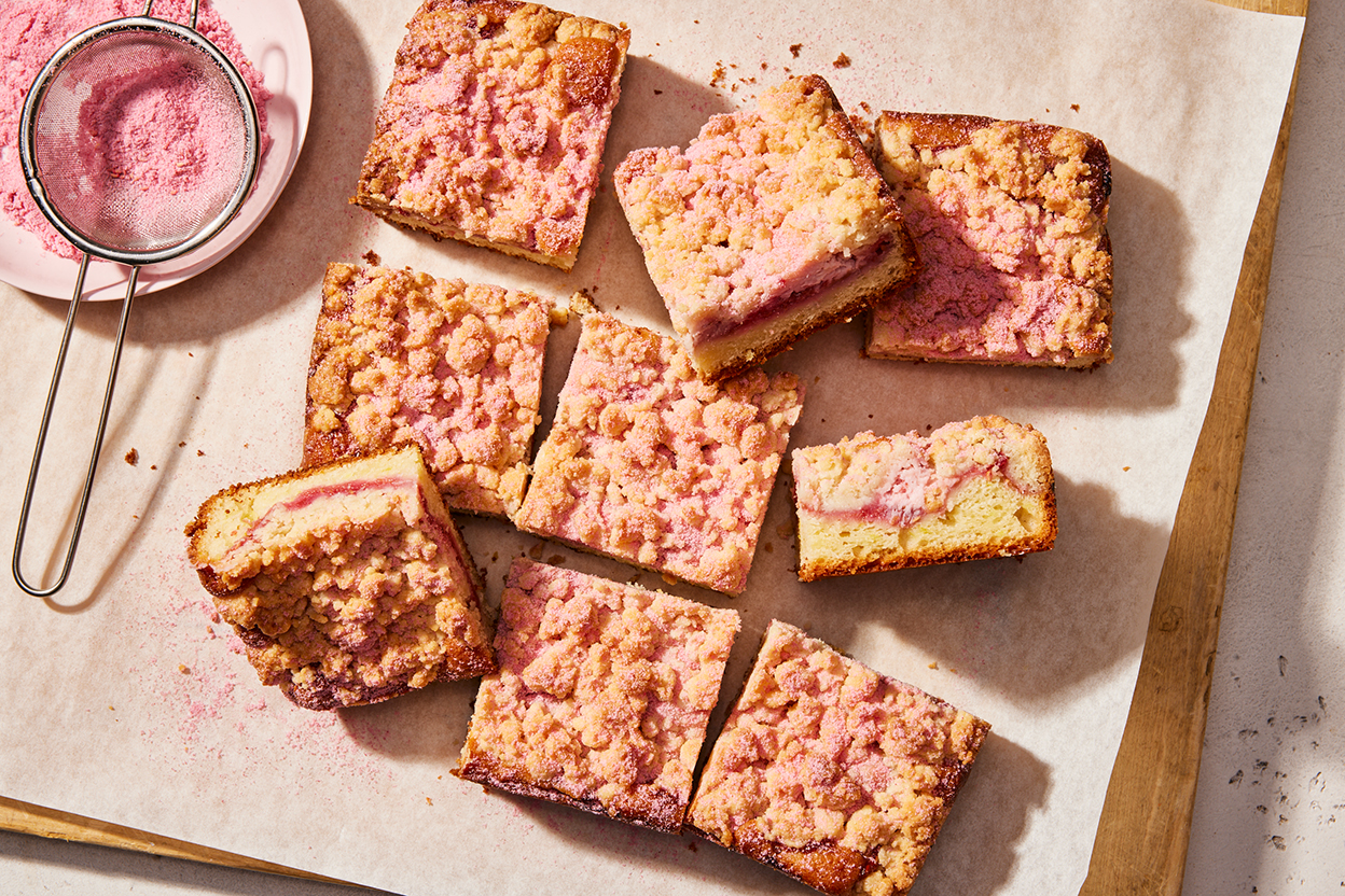 To make the topping: Using a small food processor or blender, pulse the freeze-dried raspberries and confectioners’ sugar together until they’re a fine powder. Use a fine-mesh strainer to sprinkle the topping over the coffee cake before slicing and serving.