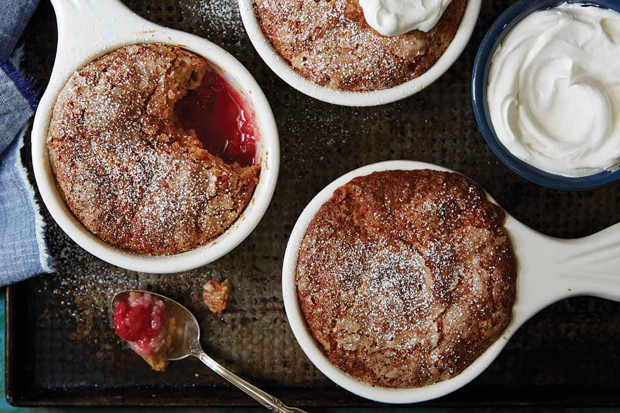 Rarely used in pudding cakes, berries join the party in this beautiful, self-saucing dessert. Line the bottoms of your baking dishes with ripe raspberries, top with cake batter, and let the magic happen.