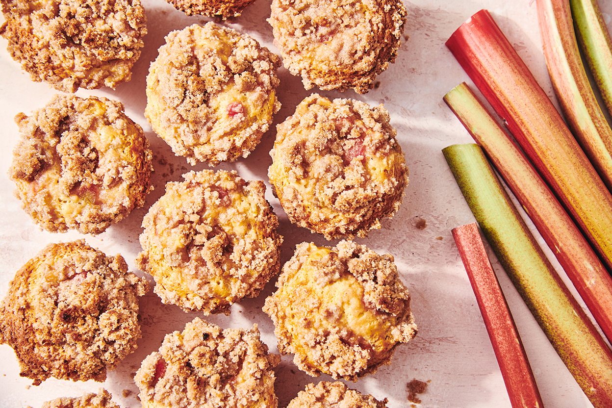 Topped with a cinnamon-laced streusel crunch, these tender sour cream muffins hide a swirl of rhubarb compote and lightly sweetened cream cheese in the center.