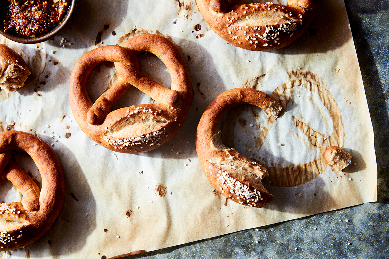 Top the pretzels with coarse kosher or pretzel salt. Using a sharp knife or lame, slash each pretzel horizontally across its base.