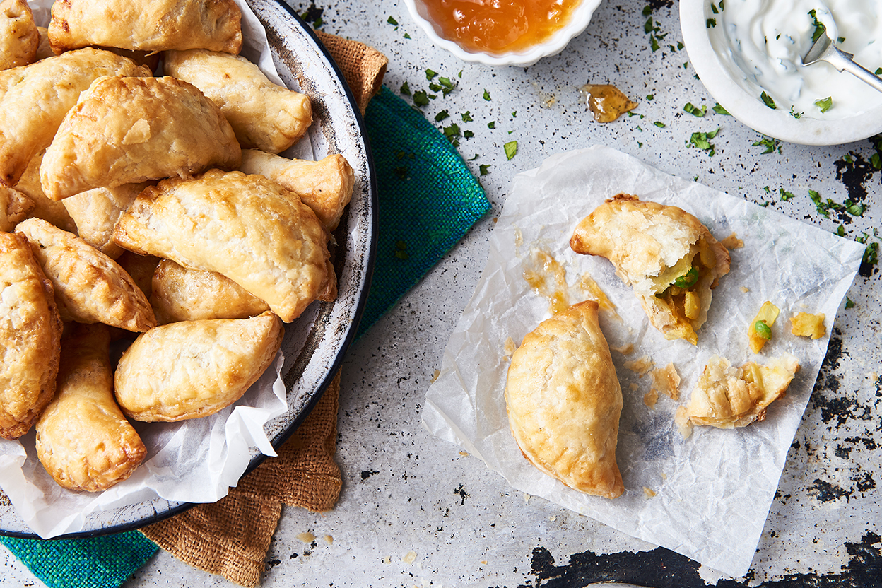From its earliest appearance in Middle Eastern and Central Asian cuisines centuries ago, the samosa (just one of its various names) has spread throughout the world. This stuffed pocket's typical butter and flour pastry lends itself to a myriad of filling possibilities. For our version of samosas, a savory filling of onions, potatoes and spices is brightened by the sweetness of peas to create an amazing snack.