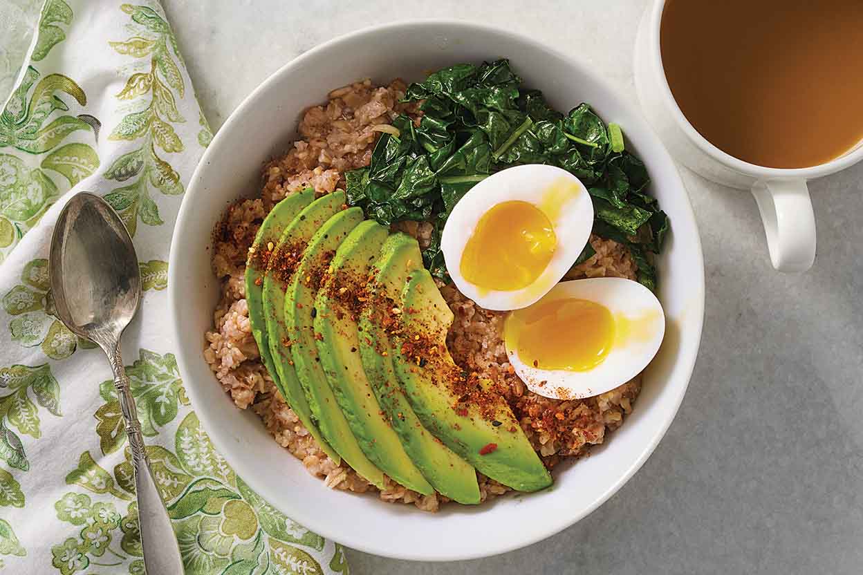 Love a bowl of hot cereal in the morning? Make it an option for a savory lunch or dinner, too. The topping possibilities are endless; from sausage, cheddar, and fresh chives to this version, with a not-quite-hard, not-quite-soft boiled egg, sautéed spinach, and slices of perfectly ripe avocado.
