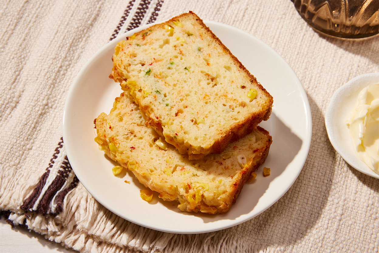 This cheesy quick bread, inspired by French cake salé, has the tenderness of a muffin but the savory saltiness of a cheesy appetizer or spicy snack. This untraditional version features both fresh sweet corn and Organic Masa Harina (for double the corn flavor), sharp cheddar cheese, and garlic oil for even more depth of flavor. Slice it up to enjoy alongside a salad or bowl of chili, griddled as a morning snack, or just piece by piece.