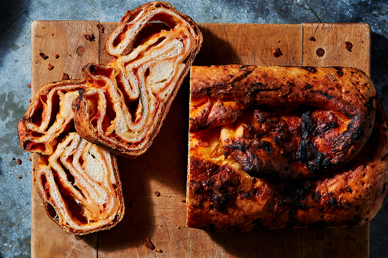 Lightly score the dough into three 9" x 4" sections. Spread the remaining sauce over the left two sections and top with the remaining cheese.