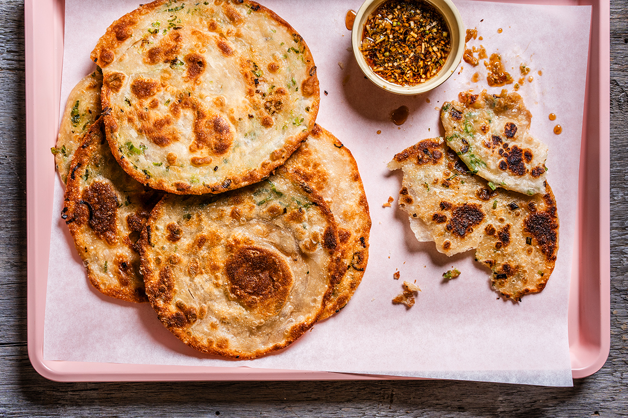 To cook the scallion pancakes: Preheat a 10" nonstick or cast iron skillet over medium heat until a few water drops flicked on the surface sizzle and almost immediately evaporate. Add 1 tablespoon neutral oil to the skillet. Gently place one pancake in the pan and cook. Using a spatula, gently press the pancake onto the hot surface. After about 2 minutes the top of the pancake will turn an opaque color and bubbles will start to appear. The bottom of the pancake will be crisp and golden brown in spots. Flip the pancake over and continue cooking in the same manner, gently pressing it onto the hot skillet surface until it’s deep golden brown and crispy, an additional 2 minutes. You may need to adjust your heat while cooking to ensure the pancakes are thoroughly cooked without overbrowning. Transfer the pancake to a paper towel to absorb any excess oil, then to a wire rack to cool slightly.