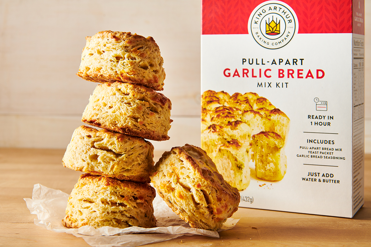 The key to making tall, soft, and fluffy herb biscuits is yeast. But don’t let that scare you away! Since this recipe starts with our Pull-Apart Garlic Bread Mix, adding yeast is as easy as stirring it with some warm water and a portion of the mix, then letting your cut biscuits rise in the pan before baking. The high-rising biscuits, with their satisfying, savory flavor and butter-crisped bottoms, are well worth the additional time.